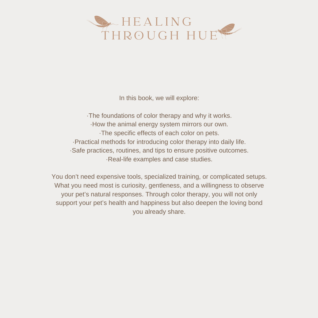 This workbook helps you put the principles of color therapy learned in the Healing Through Hue book into action through guided exercises, reflection pages, and practical tools to support your pet’s emotional and energetic balance. Each section is designed to help you tune into your pet’s unique needs, track progress, and intuitively explore the healing language of color.